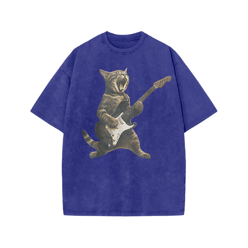 Unisex Rock Cat Playing Guitar Print Acid Washed T-shirt