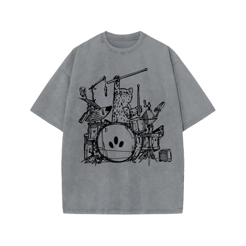 Unisex 100% Cotton Rock Cat Print Acid Washed T-shirt - Beige - US20-22(3XL) - image 1