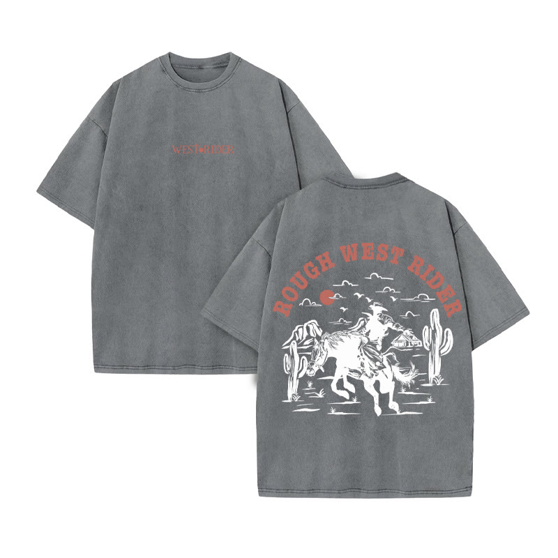Unisex ROUGH WEST RIDER Print Acid Washed T-shirt