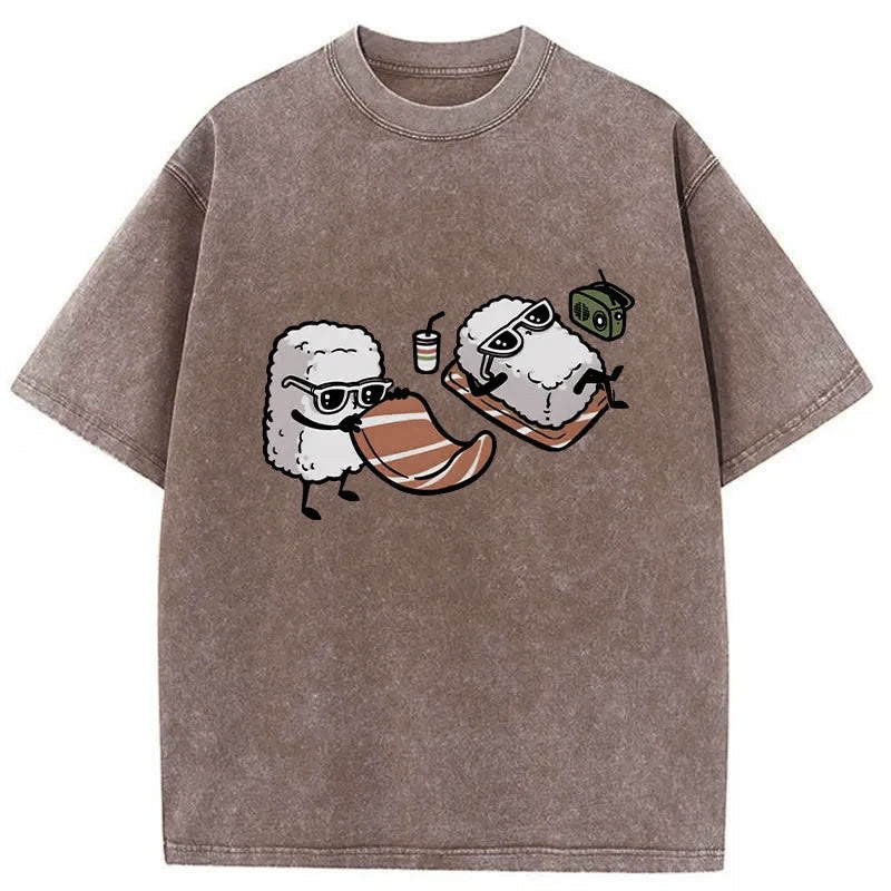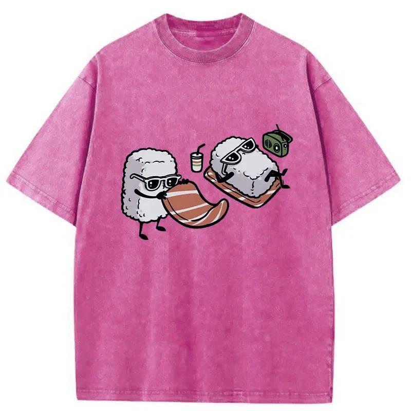 Unisex Sunbathing Sushi Print Acid Washed T-shirt