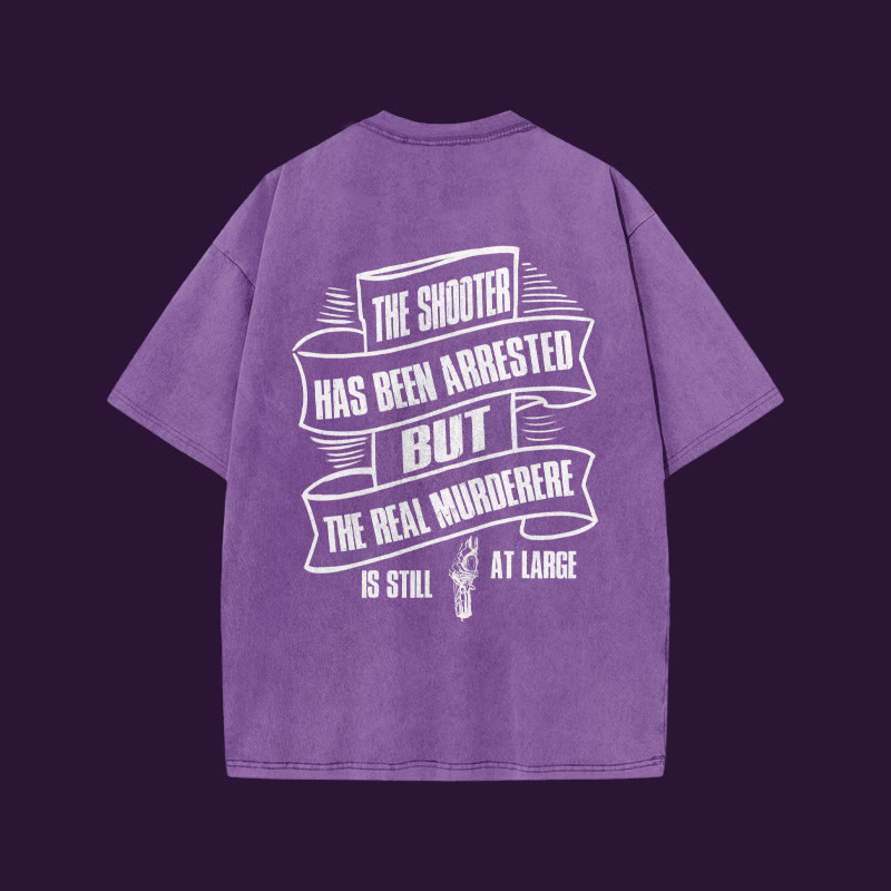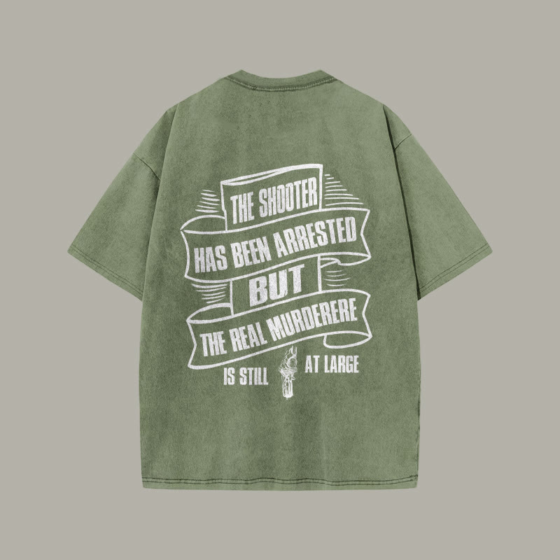 Unisex THE SHOOTER HAS BEEN ARRESTED Print Acid Washed T-shirt