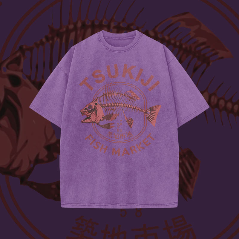 Unisex Tsukiji Market Print Acid Washed Causal T-shirt