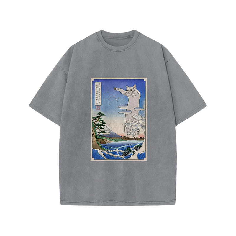 Unisex Ukiyoe Funny Cat Vintage Print Acid Washed T-shirt