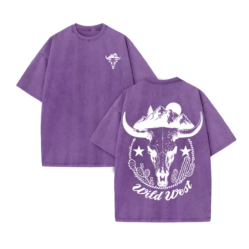 Unisex 100% Cotton WILD WESTERN Western Style Print Acid Washed T-shirt