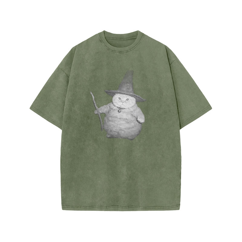 Unisex Wizard Cat Print Acid Washed T-shirt