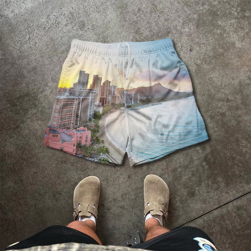 Waikiki Beach At Sunrise Print Mesh Casual Shorts