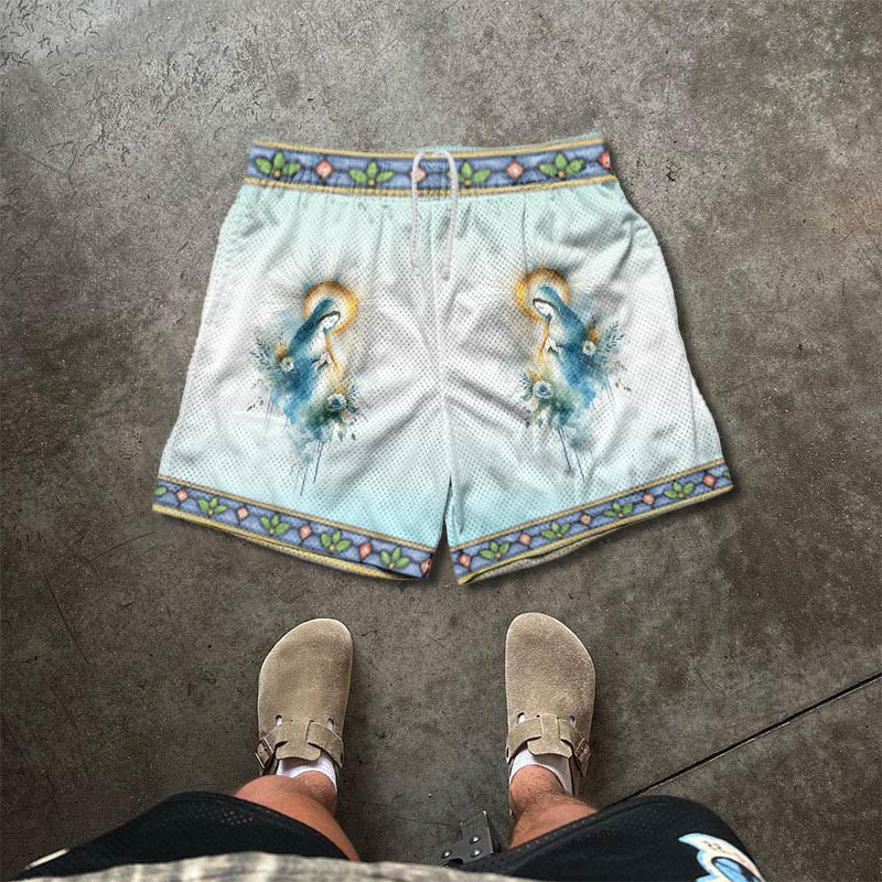 Watercolor Virgin Mary Print Mesh Casual Shorts